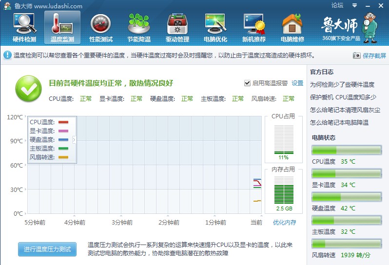 3、鲁大师能定时扫描用户的计算机的安全情况,为用户提供安全报告,有相关的资料的悬浮窗,能够显示“CPU温度”、“风扇转速”、“硬盘温度”、“主板温度、“显卡温度”等。会到微软官方网站为用户下载安装最适合用户的机器的漏洞补丁。“鲁大师”只会安装用户的机器需要升级的漏洞补丁,并支持下载同时安装,大幅提高补丁安装速度,节省热门软件推荐安装用户的等待时间。
