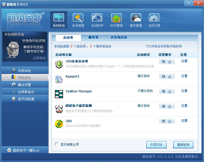 超级兔子是一款拥有超过10年的电脑功能辅助软件,可助用户轻松辨别硬件的运作状态、安装硬件的驱动程式、维护系统安全、安装系统补丁及软件升级、优化系统功能、清除系统的多余文件、提升电脑速度、保护IE安全、监测危险程序的软件。 【软件功能】 超级兔子上网精灵具有IE修复、IE保护、恶意程序检测及清除工能,还能防止其它人浏览网站,阻挡色情网站,以及端口的过滤。 超级兔子系统检测可以诊断一台电脑系统的CPU、显卡、硬盘的速度,由此检测电脑的稳定性及速度,还有磁盘修复及键盘检测功能。超级兔子进程管理器具有网络、进程、窗口查看方式,同时超级兔子网站提供大多数进程的详细信息,是国内最大的进程库。超级兔子安全助手可能隐藏磁盘、加密文件,超级兔子系统备份是国内唯一能完整保存Windows XP/2003/Vista注册表的软件,彻底解决系统上的问题。 注:由于体积的关系,标准版没有提供桌面秀、磁盘加速器等工具,如要使用这些组件,请下载专业版。如系统已装有旧版兔子,请不必卸载旧版,直接安装标准版也可以升级为专业版。 更新说明: 1.加入新版魔法设置. 新版魔法设置去掉了旧版中的部分在XP和WIN7中已经失效的功能. 2.加入开机时间检测. 3.将"恶意网址修复"整合到"恶意程序卸载"面版中, 并加入"流氓快捷方式"清理功能. 4.修复软件管理软件下载功能中偶尔无法正常读取软件下载链接的问题. 5.调整系统痕迹清理的界面. 6.调整兔子软件首页界面结构 7.调整系统防护首页界面结构