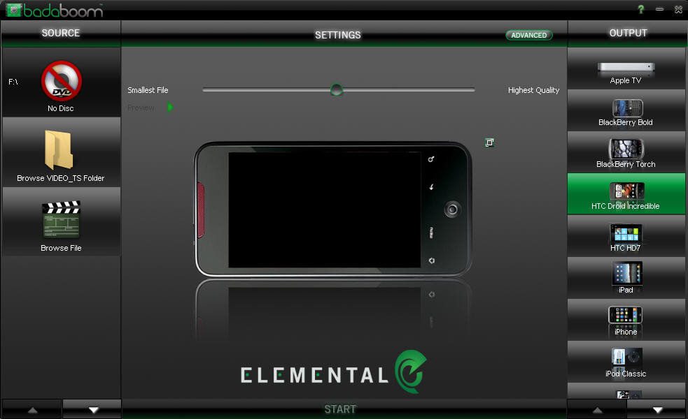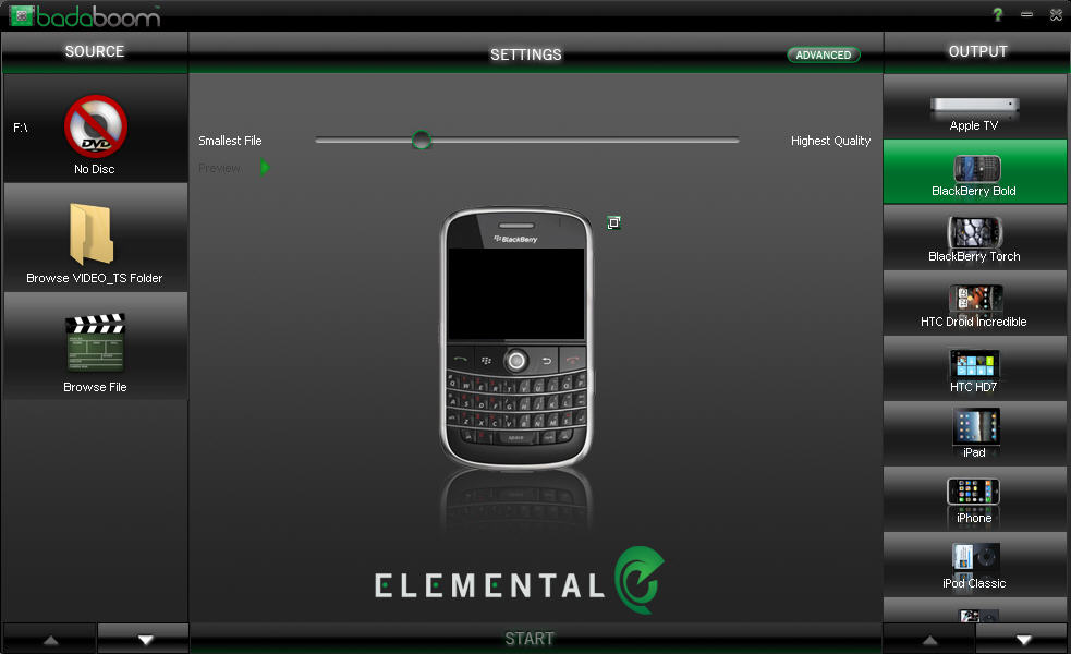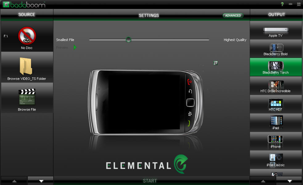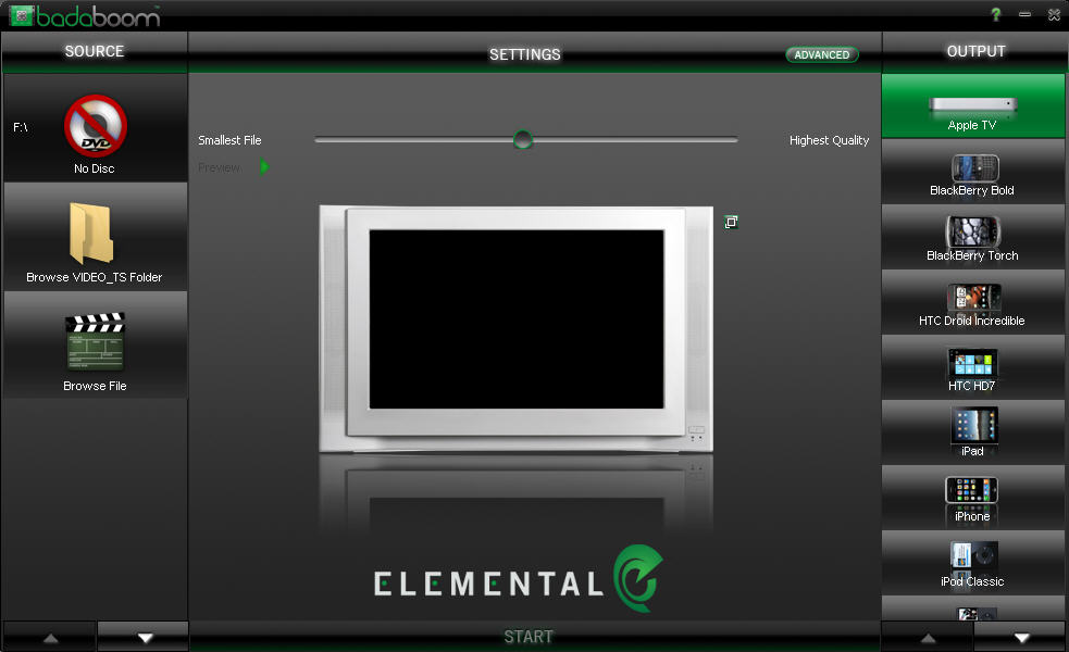 Badaboom高质量的H.264视频编码器和双通道立体声音频输出特别为现代便携式媒体设备而设计,其中包括苹果iPod和索尼便携式Playstation。未加密DVD(没有版权保护的DVD)、电视录像和AVCHD影片等输入源可以快捷、方便地进行转码,消费者由此可以随时随地地欣赏视频。