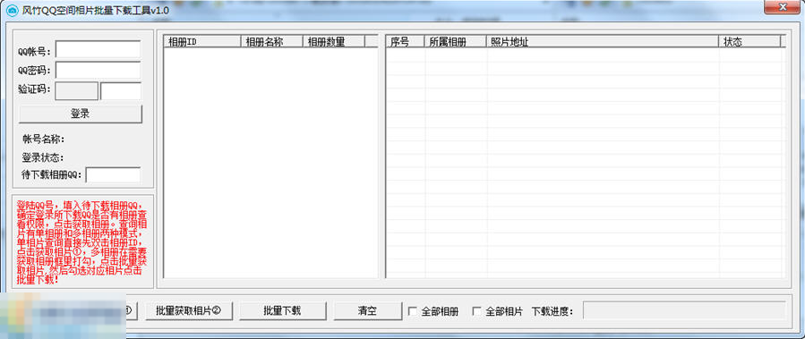 风竹QQ空间相片批量下载工具是一款非常不错的空间相册下载软件。功能完善,使用方便。该软件操作简单,能够帮助用户轻松下载qq空间中的照片!有需要的可以来下载使用!