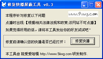 快播屏蔽修复工具针对用户点播时弹出屏蔽问题,如果您的快播出现这样的问题,那么使用本工具后即可解决您的困扰。 提醒:每次快播更新时只要使用本工具修复可,如果本工具失效的话,请检查快播的版本。适用于3.5版本,不支持4.6测试版。
