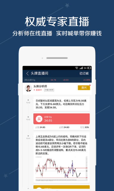 6.专家策略:专业分析师在线直播,实时分析行情走势,一对一解答投资问题。