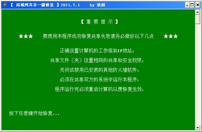 本工具可一键修复各类因系统优化、设置不当而造成的局域网共享失败问题,对于打印机无法共享、系统网上邻居、工作组无法浏览、打开缓慢等问题同样有效。采用批处理制作,使用简单高效,免去用户手动设置的繁琐。使用后必须重启计算机,否则修复无效。本工具完全兼容uac,对vista、win7都有很好的修复效果,软件已经通过virscan网站集成的几十款杀毒软件的检测,请大家放心使用!