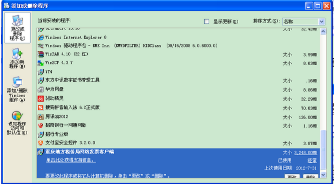 卸载网络发票客户端方式。在“控制面板”中“添加/删除程序”里面找到“重庆市地方税务局网络发票客户端”点击“删除”