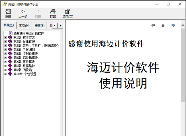 海迈计价软件操作手册是一份*.chm格式的海迈计价软件教程,涉及的方面包括软件安装,台账管理,菜单、工具栏、快捷键简介,工程编制、控制价模块、招投标模块、审核模块、数据维护、回收站和个性设置等。