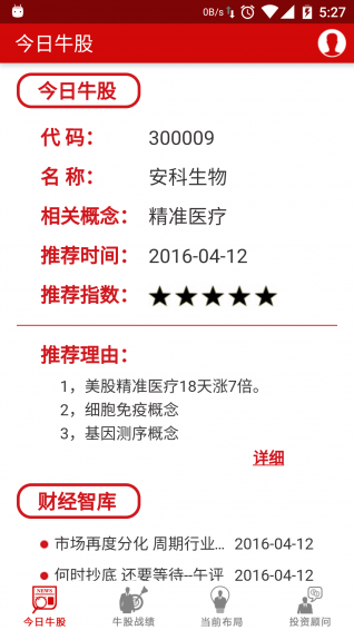 牛股先锋app为了帮投资者把财富值增至最优化,为了满足投资者不同的投资理财需求,免费提供最强牛股,实时查询牛股资讯,提高顾客的投资技巧,强大的作战团队带你突出重围,降低风险,成为最强的股市牛人。