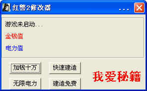 适用于红色警戒2共和国之辉的作弊工具,修改电力能量和金钱的数目!支持快速建造,建筑加速修改,建造免费等。需要进入游戏修改。