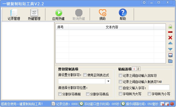 一键复制粘贴工具对于经常要对大量数据进行复制粘贴的朋友,虽然可以通过ctrl+c、ctrl+v来完成,但这样不仅繁琐、容易按错,长时间重复操作后还会感觉手指疲劳。基于以上原因编写了此程序,实现了一键复制粘贴的功能。