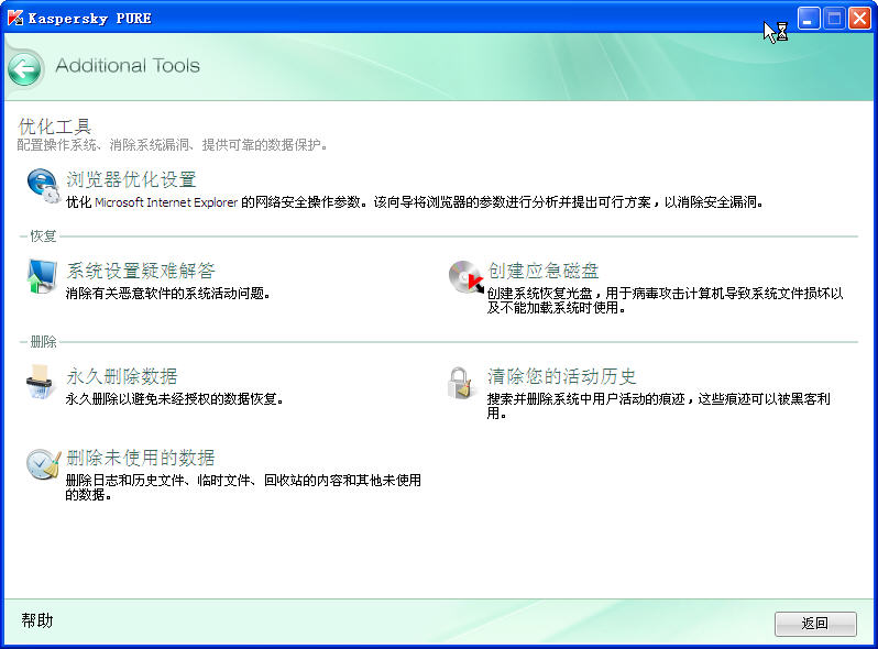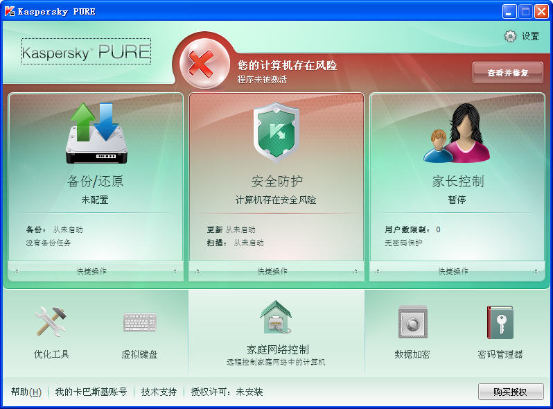 kaspersky pure(原kts) 是卡巴斯基最新研发的全功能版本,除具备kis的全部功能外特别集成了系统优化、数据加密、数据备份以及第三方强大的 密码管理软件 无疑将会是卡巴斯基力推的旗舰产品。