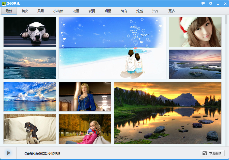 十大分类:美女、风景、小清新、动漫、明星、爱情、萌宠、影视、汽车,海量壁纸任你选择,分类更详细,内容更丰富,时时为您添加最新的壁纸,让您的电脑天天都有最新、最精致的表情。