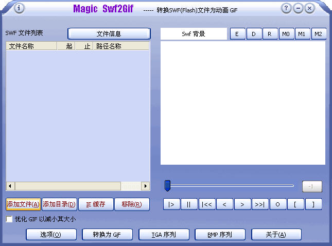 一个功能强大而且非常容易的Flash动画转换工具,程序可以帮助你快速高效的将SWF格式的Flash动画转换为GIF格式的图片动画文件格式,原来Flash动画中的动画帧数和分辨率都可以完整的保留下来,转换后的GIF文件能有效的减少播放动画时的CPU资源占用,并可以从此不再依赖Flash播放插件,支持批量转换功能。
