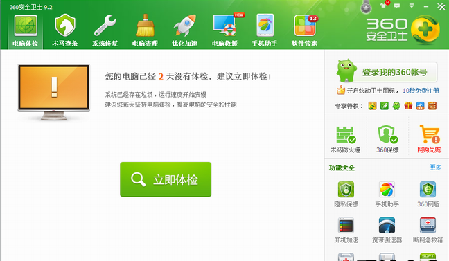 360安全卫士2016最新版是款目前国内使用最广泛的安全软件。360安全卫士2016最新版使用简单,功能强大,提供了电脑体检、查杀木马、垃圾清理、优化加速四大功能,还提供了网购先赔等附加功能,其丰富的个性实用小工具受广大用户喜爱。