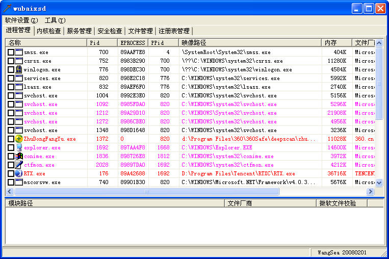 驱动加载的情况下,Wsyscheck的删除功能已经够用了,大多数文件都可以立即删除(进程模块可以直接使用右键下带删除的各项功能),加载的DLL文件删除后虽然文件仍然可见,但事实上已删除,重启后该文件消失。