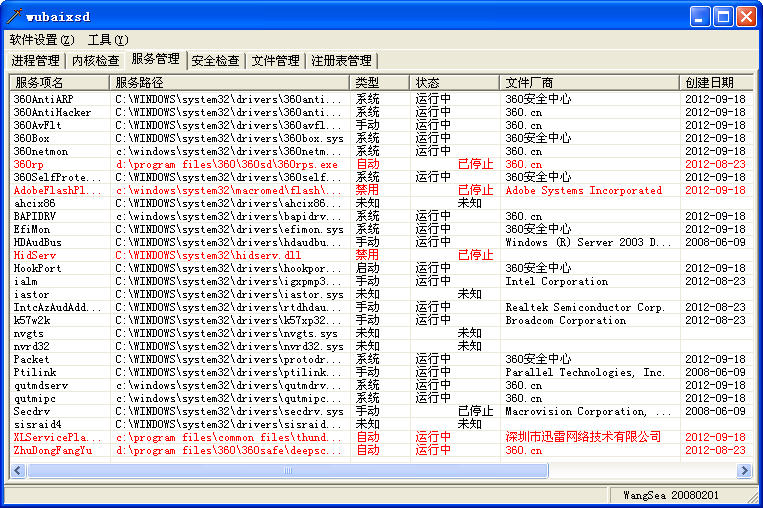 在取消了“模块、服务简洁显示”后,查看第三方服务可以点击标题条”文件厂商”排序,结合使用“启动类型”、“修改日期”排序更容易观察到新增的木马服务。