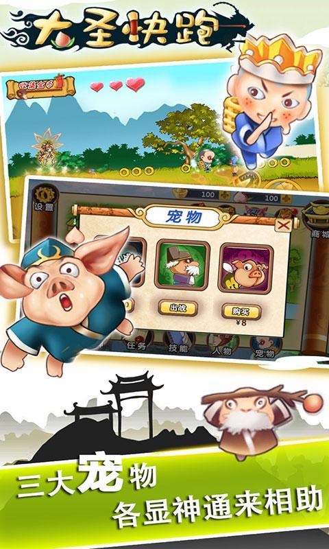 大圣快跑是一款非常好玩的横版跑酷手游,西行之旅与你同行,八戒唐僧等多种宠物助你冒险,斩妖除魔荡平危害就在大圣快跑,一起来玩吧!