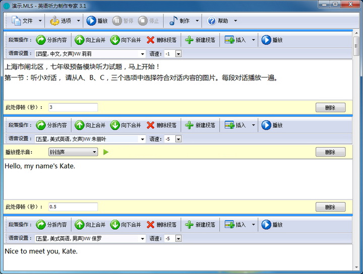 7、可任意调整每部分内容的朗读语速等,可针对不同年级的学生制作出不同难度的外语听力资料
