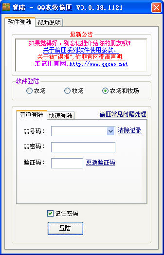 以辅助玩家游戏为目的的,实现更加便捷方便的玩游戏 , 主要因为现在的游戏操作过于复杂,所以玩家们都想需要一款QQ农场+ QQ牧场的辅助工具软件来帮助游戏。 QQ农牧偷匪不具有修改游戏数据,损坏游戏功能!只有这类辅助工具是合法的。 1.更新牧场最新协议(重要) 2.修复QQ农牧偷匪自动出错问题 3.修复一些已BUG 部分杀软或安全软件 会拦截请“允许”或出现误报 否则会出现去广告失效 如不放心可放弃下载 软件自动释放桌面 请关闭360或其他安全软件
