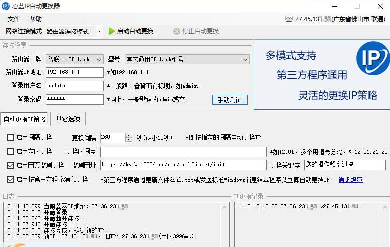 请在购买前先手动测试是否可换IP,或加QQ276548160远程协助调试,一般来说均可实现自动更换IP。