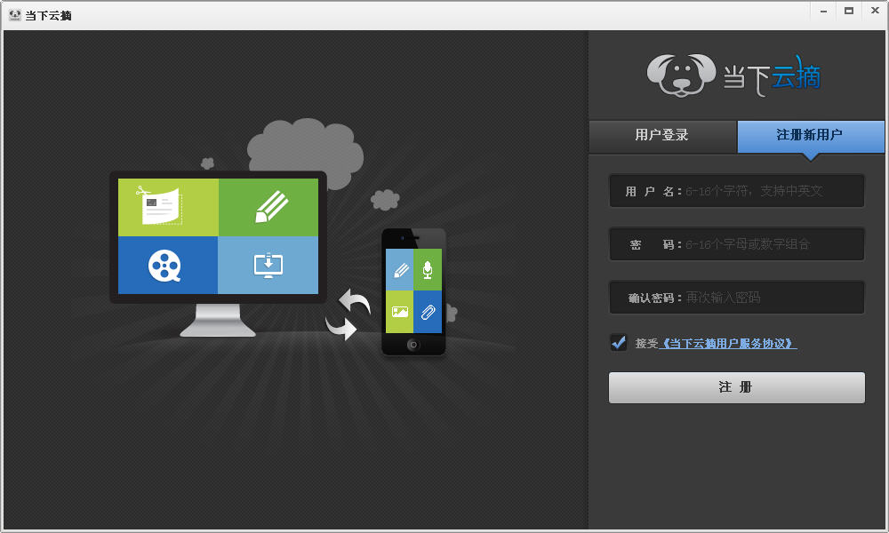 当下云摘是以网页剪报和用户笔记为主,终端本地资源采集为辅,在本地存储和云端存储结合,面向用户多终端提供内容在线展现、同步、分享、搜索等应用。