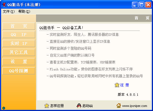 QQ必备工具软件。QQ狙击手V2.4在前一版本的基础上优化了部分算法以及部分代码,运行速度更快。支持QQ目前几乎所有版本,支持所有windows操作系统。实时动态的监测出包括好友、陌生人、腾讯服务器及腾讯广告服务器代理的IP地址及端口;直接在QQ的接收/发送窗口上显示IP以及地理位置信息;可以同时监测多个登陆的QQ号码;自定义QQ客户端的默认端口号;增加了IP助手功能,可以方便的查看主机IP配置信息、TCP链接表以及UDP链接表;修正和补缺了小部分IP地址。