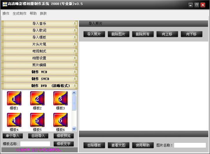 <<高清晰影楼相册制作系统>>是一款专业的影楼相册制作软件。操作简单,制作效果清晰,只需几步即可制作VCD,SVCD,DVD,高清晰的影楼电子相册。 能将数码照片转成VCD/SVCD/DVD/格式,简单易用,功能强大,是制作VCD/SVCD/DVD电子相册的最佳选择。 主要特点: 体积小巧,容易上手。简单易用,功能强大。具有专业的照片特效和转场特效。支持VCD/SVCD/DVD(高清晰)格式。导入多首背景音乐。在正式制作生成前,可以预览效果。 快速制作生成。符合广大用户的实际需求。