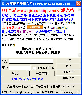 采用系统识别库登陆 支持大部分系统自动识别 全自动扫描代理IP是否可用 登录时自动验证IP是否可用(不可用自动更换) 全面支持QT任何版本,支持最新版本QT3.5 修复虚拟机无法输入账号BUG 彻底解决无法输入账号问题 采用识别系统登陆,将提升,登陆效率,准确率