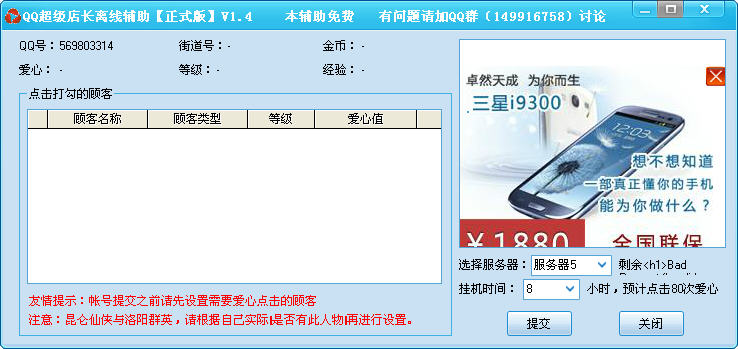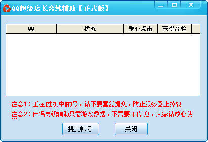 超级店长伴侣离线辅助采用的最安全的登录方式,不用输入帐号密码直接登录辅助。目前版本支持离线爱心点击功能,选择设置自己需要点击的顾客,选择设置挂机时间1----12小时。 重要提示:离线挂机的号在挂机期间禁止与任何其他辅助同时使用。 使用方法步骤:选择需要点击顾客-------选择脱机挂机时间--------选择服务器点击提交,然后关闭软件即可。有伴侣服务器为你免费挂机。 部分杀毒软件会误报风险,请添加信任即可
