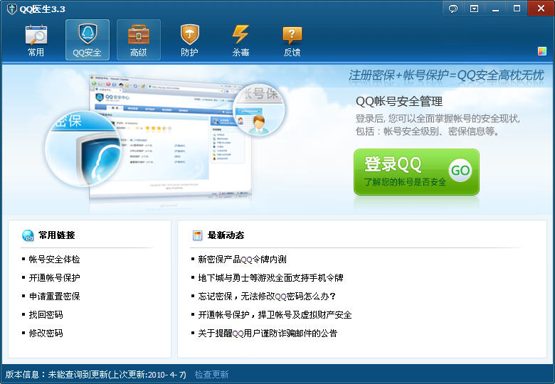 QQ医生是腾讯公司发布的专门针对QQ帐号密码被盗问题所提供的一款盗号木马查杀工具,它将准确扫描并有效清除盗号木马,从而保障QQ帐号的安全。