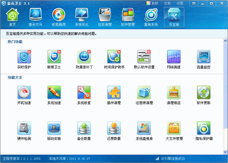 大家好,金山卫士“极速下载版”论坛公测版发布,与普通版本主要差别在于集成了强劲的p2p下载引擎,全面提升了『软件管理』和『漏洞修复』下载速度;下载前,请先阅读以下内容。注1:先卸载已安装版本,再安装金山卫士"极速下载版"覆盖安装会感受不到下载引擎效果。注2:若对公测版有咨询和反馈,请在发帖时标题注明:极速下载版+简述,以便工作人员跟进。版本号:3.1.1.1670 更新日期:2011.8.16 8月16日更新说明:增加了p2sp协议支持,提升了下载速度和下载稳定性;修正了所有已在bug;