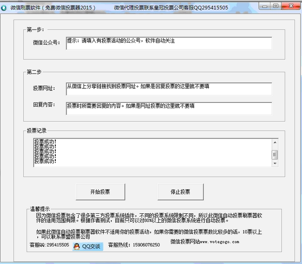 微信投票软件(免费微信刷票器2015)是一个免费的2015年最新的通用微信投票刷票神器,一个可以帮助选手突破微信投票系统限制的快速自动投票工具,可以在短时间帮助选手获得大量的投票数。