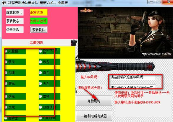CF擎天刷枪助手软件是一款免费实用的cf游戏刷枪软件,此款软件能够帮助用户刷取火麒麟、黑骑士、雷神、烈龙、龙啸、盘龙等稀有神器。