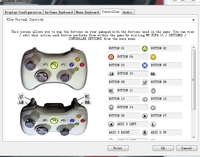 然后按照下面这张图来设置键盘按键的映射:在VJOY里按照手柄上的按键顺序(下图)映射好键盘上要用到的按键,(比如要映射按钮1,就点按钮1右边的”…”按钮,然后输入自己想要的键盘按钮,以此类推全部设置好后按OK最小化。特别注意玩游戏的时候VJOY不能关闭)最后运行FIFA11的设置程序fifaconfig.exe,设置一下键位就行了。