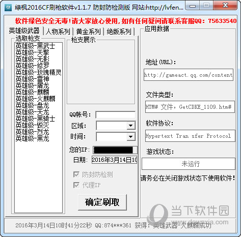 绿枫2016CF刷枪软件是一款针对腾讯旗下动作射击类游戏——《CF穿越火线》的辅助工具。这款绿枫2015CF刷枪软件能帮助玩家用户进行刷英雄级武器、任务系列、黄金系列和绝版系列枪械,让你在游戏中与众不同!