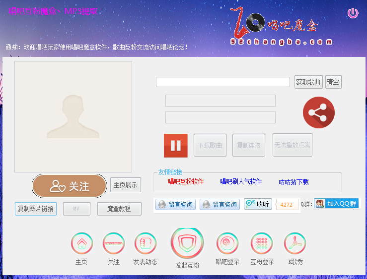 如果i你在玩唱吧,那么就不能错过唱吧互粉魔盒MP3提取工具,它既能帮助你快速增长粉丝,又能提取唱吧中的MP3文件并可直接分享到空间等社交网络中。