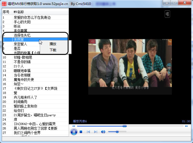 1、打开工具之后,软件会自动获取唱吧排行榜的歌曲MV