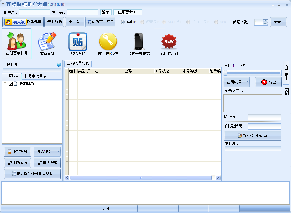 百度贴吧推广大师是一款全自动的百度贴吧推广工具,包含帐号注册、帐号激活、帖推广、文章伪原创、发帖回帖文章采集、发提升等级、回帖推广、关注喜欢贴吧等等不同功能。主动换ip,能使用代理模式、路由器换ip模式、adsl模式,操作简单,支持验证码识别,模拟手机贴吧等等功能。