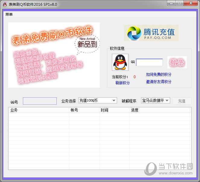 表弟刷Q币软件是一款能够帮助用户进行免费刷Q币的辅助小工具。这款刷q币软件免费版2016功能强大,操作简单,超强刷Q币引擎,安全无毒,支持开钻,游戏充值等,完全做到0费用,赶紧试试吧!