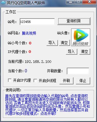 风竹QQ空间刷人气软件是一款由风竹软件最新推出的免费空间人气工具,这款软件支持批量小号刷QQ空间人气,附带小号管理工具和代理IP检测工具,软件操作简单,支持小号批量刷人气,注意不要刷人气的个数大于QQ号,否者可能出错。担心自己空间人气不够的朋友快来试试这款软件吧!