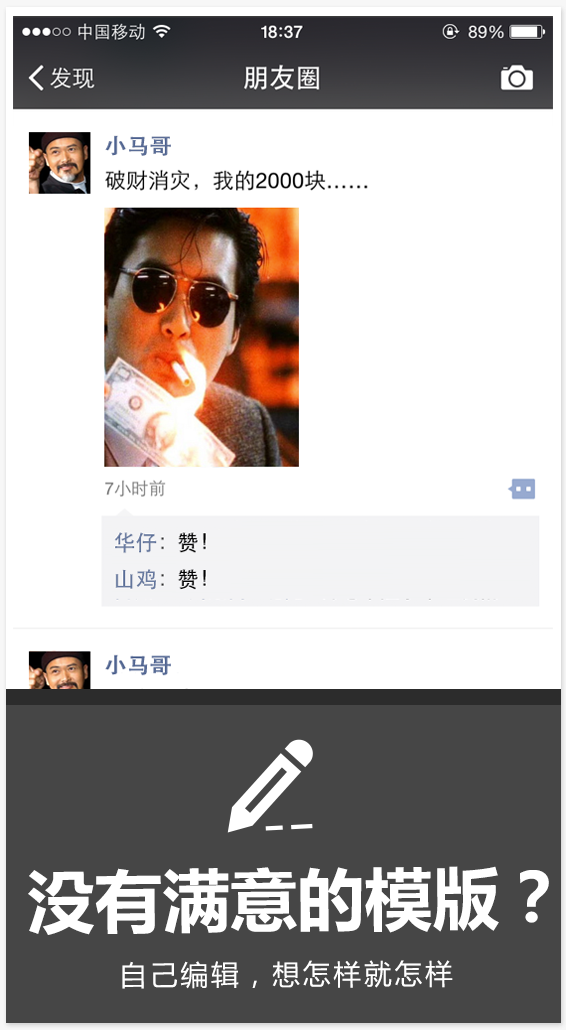 朋友圈神器是一款超级逼真的朋友圈调戏好友搞怪装blitty的超级神器。想让苍井空出现在你的朋友圈吗,想让吴亦凡、周杰伦、angelababy与你贴近距离吗,快快使用朋友圈神器吧!在朋友圈装逼的梦想我们帮你承包了!恶搞朋友,恶搞明星,恶搞同学通通木有问题,欢迎下载体验。