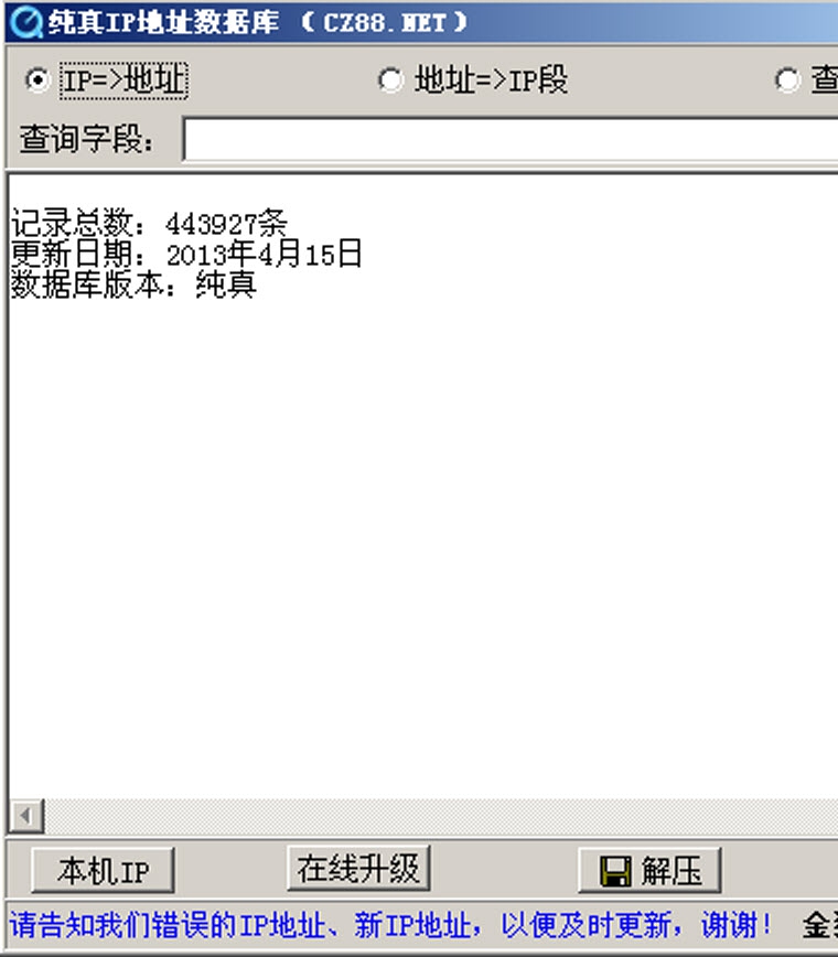 纯真版IP地址数据库是当前网络上最权威、地址最精确、IP记录以及网吧数据最多的IP地址数据库。收集了包括中国电信、中国移动、中国联通、铁通、长城 宽带等各 ISP 的最新准确 IP 地址数据。通过大家的共同努力打造一个没有未知数据,没有错误数据的QQ IP。IP数据库每5天更新一次,请大家定期更新最新的IP数据库!因为IP地址数据是民间收集的,而IP地址段会经常更改,所以有点遗漏、错误是难免的。可通过随数据库附送的软件(IP.EXE)对IP地址进行查询。假如发现IP地址有不对的,或想提供新的IP地址,请到纯真IP小秘书提供IP地址数据,或者登陆纯真时空论坛“电脑板块”中的“IP地址”版块告诉我们。或者加入纯真QQ门户,在QQ上就能直接上报错误的IP数据,以便及时更新IP数据库