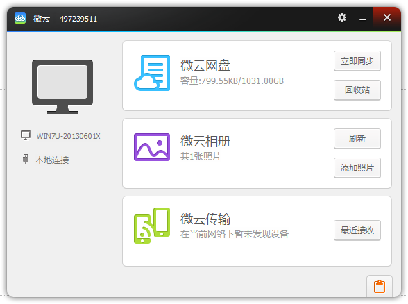 启动微云后,微云将自动搜索同一个局域网下安装了微云的设备。