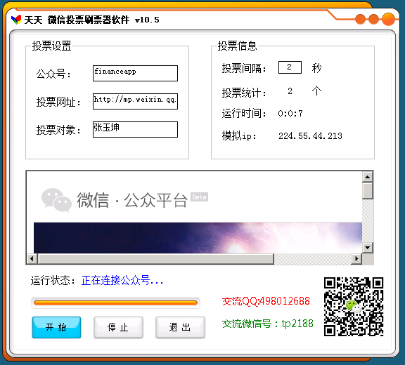为此,天天开发了这款微信投票刷票器软件,经过身边的朋友试用,几经升级,到目前的v10.5版本,已经能对80%的活动进行有效投票,欢迎下载微信投票刷票软件。