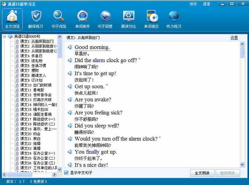 英语口语学习王是一款免费的英语口语学习软件。它精选了《英语口语8000句》、《常用口语800句》、《出国实用英语会话》、《英语900句》、《英语会话300句》等常用英语口语教材,共计一万二千多句,所有句子均采用真人语音朗读,并配以中文译文,通过全文朗读、句子即指即读、录音对比、句子听写等实用的英语口语学习王软件功能,帮助您迅速提高英语口语和听力水平。