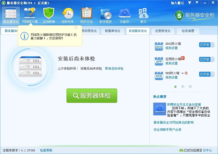 服务器体检、系统漏洞修复、系统帐号优化、目录权限优化、系统服务优化、注册表优化、垃圾清理,服务器安全狗提供最全面,最便捷的的服务器系统优化。