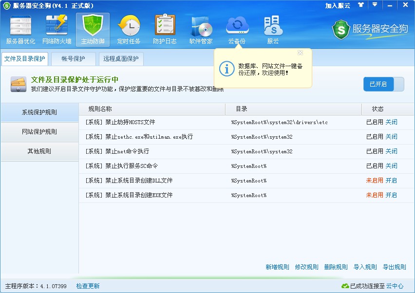 文件目录守护,从文件驱动层保护服务器文件不被非法修改;帐号保护,帐号权限设置保护服务器安全,防止黑客提权;远程桌面保护,有效防止黑客登录服务器远程桌面。