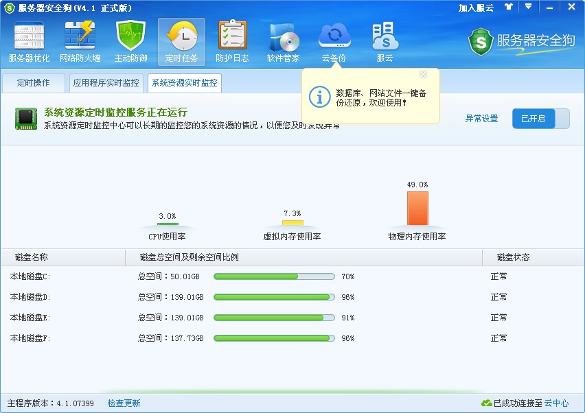 定时操作方便服务器关机重启;应用程序实时监控保证应用程序及服务异常关闭时自动启用,保障应用程序及服务持续运行;系统资源实时监控,服务器系统资源实时监控,及时了解服务器异常。