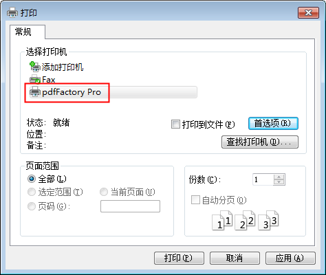 2、在打印窗口中选择pdfFactory Pro进行打印。