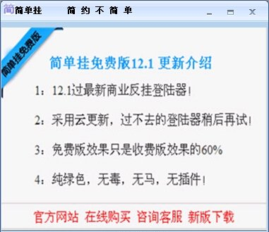 简单挂凭借着它简易操作、功能实用、对于任何登陆器都是秒过的情况下三年的时间在传奇辅助界的名誉一直名列前茅,并深受广大玩家的喜爱,本辅助也在诸多玩家的口碑当中得到了有利的发展和生存。我们一直秉着用户至上的发展模式来经营简单挂以有三年之久,目前对于简单挂这个品牌已经家喻户晓,深入人心,简约而不简单打造传奇最给力的免费辅助!