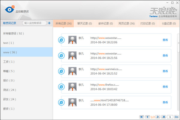 天狼眼网络监控软件是一款中小型企业办公监控软件,可以有效地限制并监管员工的办公上网行为,并提高员工工作效率。