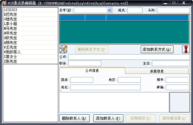 VCF通讯录编辑器适合于编辑手机通讯录备份。用户只需把备份的通讯录文件 Contacts.vcf复制到执行目录,再运行vcf通讯录编辑软件就可以在电脑上进行编辑了。